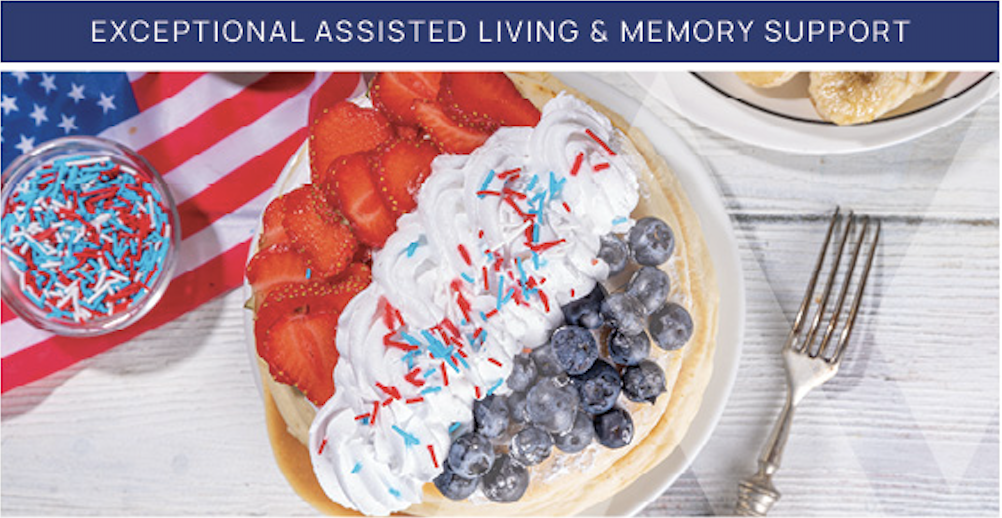 pancakes, sausage, bacon, fruit, and a selection of beverages.